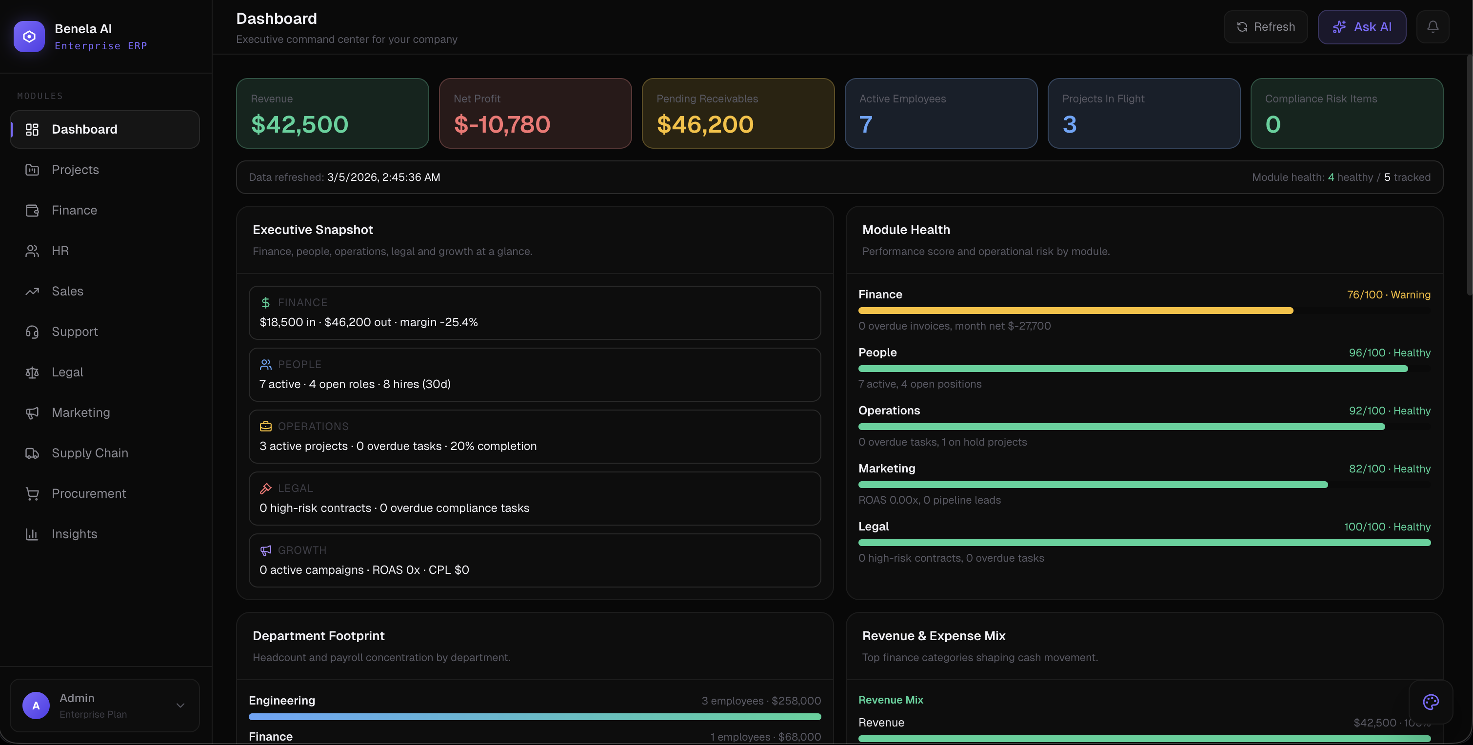 Benela unifies Finance, HR, Sales, Legal, Support and more into one intelligent workspace. Ask, analyze, automate, and act from a single operational command center.